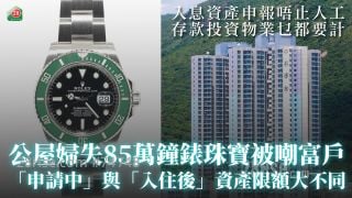 公屋妇失85万钟表珠宝被嘲富户 「申请中」与「入住后」资产限额大不同|入息资产申报唔止人工 存款投资物业乜都要计