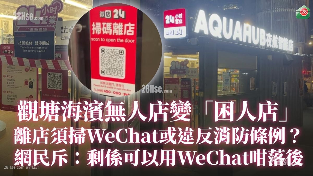 有网民日前在社交平台Threads分享,指自己曾到上述「无人商店」参观,并质疑该店出入设计有问题,进店毋须扫描二维码,惟离店时发现大门已自动上锁,须以WeChat扫描QR Code方可解锁离开。事主称因未有安装WeChat,按店内「呼叫客服」按钮后等候约10分钟仍无回应,加上店内「离店扫码」标示旁的客户服务电话,竟然是一个「86」字头的内地长途电话号码;在无计可施的情况下,事主最终只能爬窗离开。