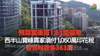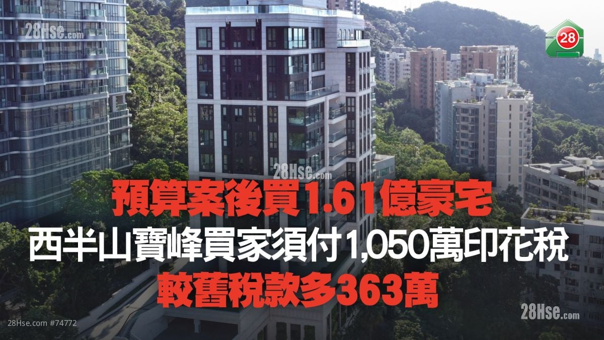 新一份《财政预算案》将1亿元以上豪宅印花税率调升至6.5%,仍无阻买家入市步伐。西半山宝珊道新盘宝峰,于新税率生效当日录得一宗逾亿元成交,一伙4房户以1.61亿元招标卖出,新买家须缴付约1,050万元税款,较旧税款高出363万元或53%。
