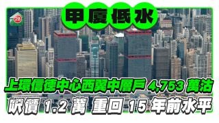 上环信德中心西翼中层户4,753万沽 尺价跌至1.2万 重回15年前水平