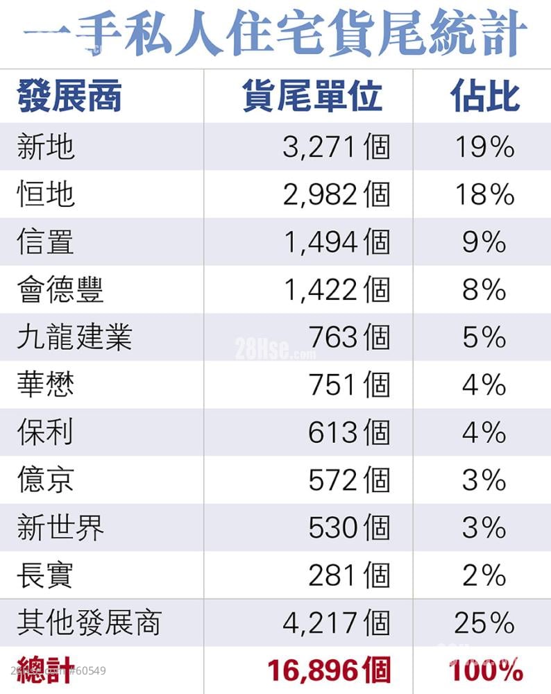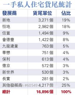 (Li Zi-tian) With nearly 17,000 unsold flats in inventory of first-hand projects, developers have had no choice but slash prices. According to real estate agency data, as of July this year, 16,896 new developments were launched since 2016. Among them, Sun Hung Kai Properties (SHKP) and Henderson Land have the largest number of unsold units, accounting for nearly 40% of the leftover flats. SHKP had 3,271 unsold units, accounting for 19% of the total, while Henderson Land had 2,982 units, or 18%, with the largest number of two-, three-, and four-bedroom flats remaining.