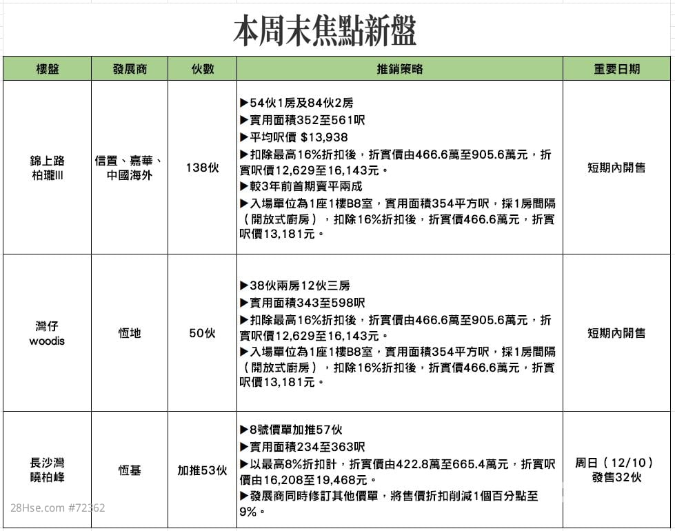 新界方面,信置、嘉華及中國海外合作發展的元朗錦上路柏瓏III,同日亦公布首批價單,合共約138伙,折實平均呎價13,938元;入場1房折實價為466.6萬元,屬近年鐵路項目入場價最平之一。是次定價較項目首期有約兩成折讓,市場估計最快下周開售。
